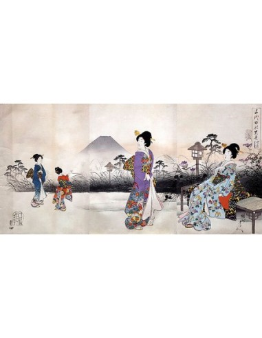 Japoneses en el paseo frente al monte Fuji