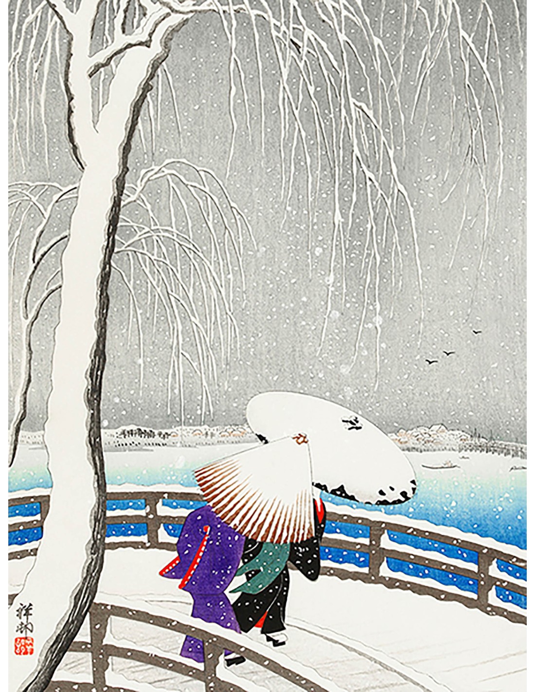 Dos mujeres en la nieve en el puente Yanagi