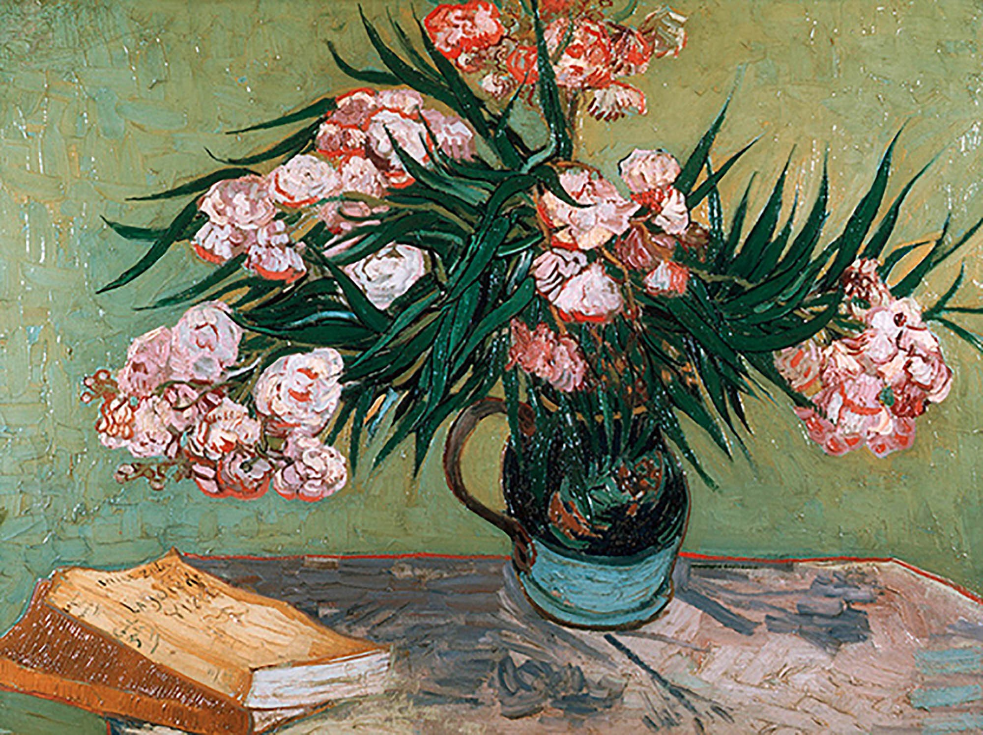 Jarrón con adelfas y libros
